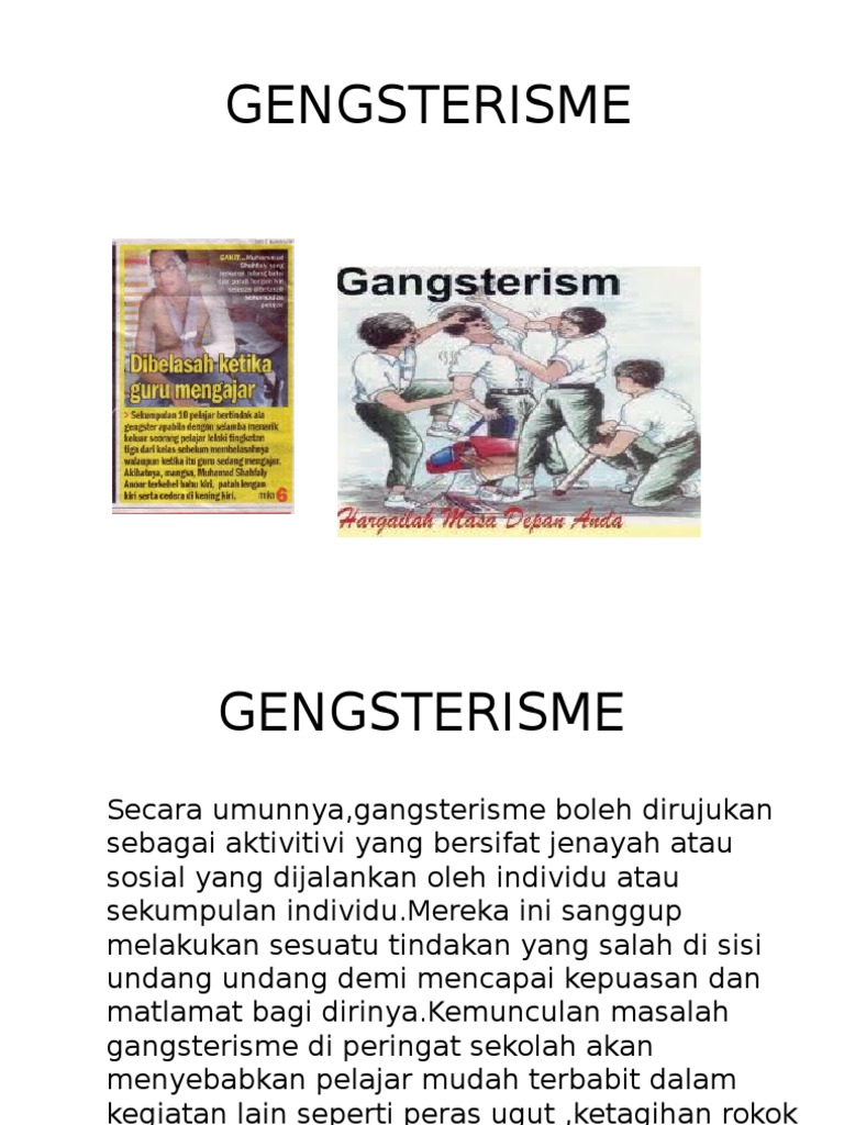 Ia perlu ditangani kerana gengsterisme boleh. Menanam minat dalam beberapa hobi seperti membaca bermain badminton dan lain-lain. Gengsterisme merupakan satu fenomena yang dianggap menular di kalangan remaja pada masa kiniIa dilihat bukan sahaja berkemampuan menghalang pencapaian pelajar dalam akademik malah boleh menganggu perkembangan remaja dalam arus pembangunan negaraKegiatan gengsterisme ini perlu ditangani secara serius kerana.